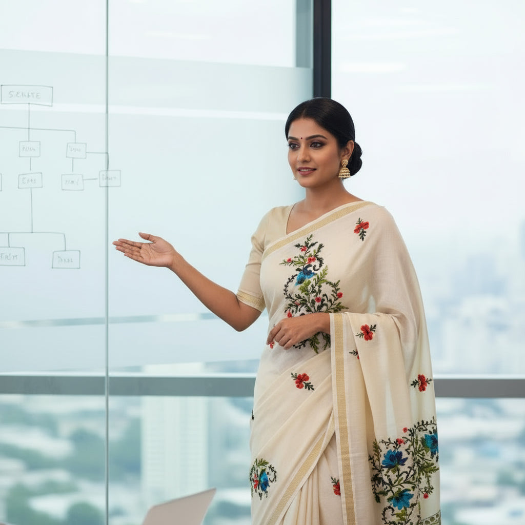 Our collection is designed for the modern professional who wants to embrace cultural heritage without compromising on comfort, style, or functionality. Whether you're attending a virtual meeting, a client presentation, or a day at the office, our sarees are crafted to make you feel confident, empowered, and ready to conquer your workday.