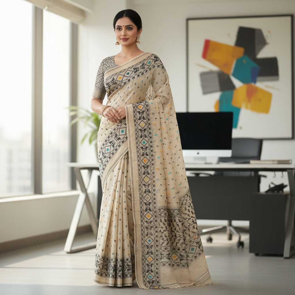 Elevate your ethnic wardrobe with this exquisite Dhakai Jamdani saree, a masterpiece of traditional Bengali weaving.