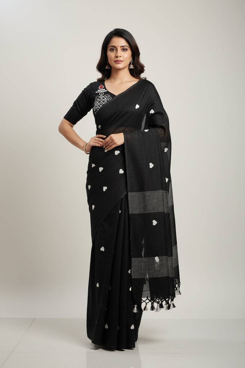 Black Heart Print Khadi Saree
