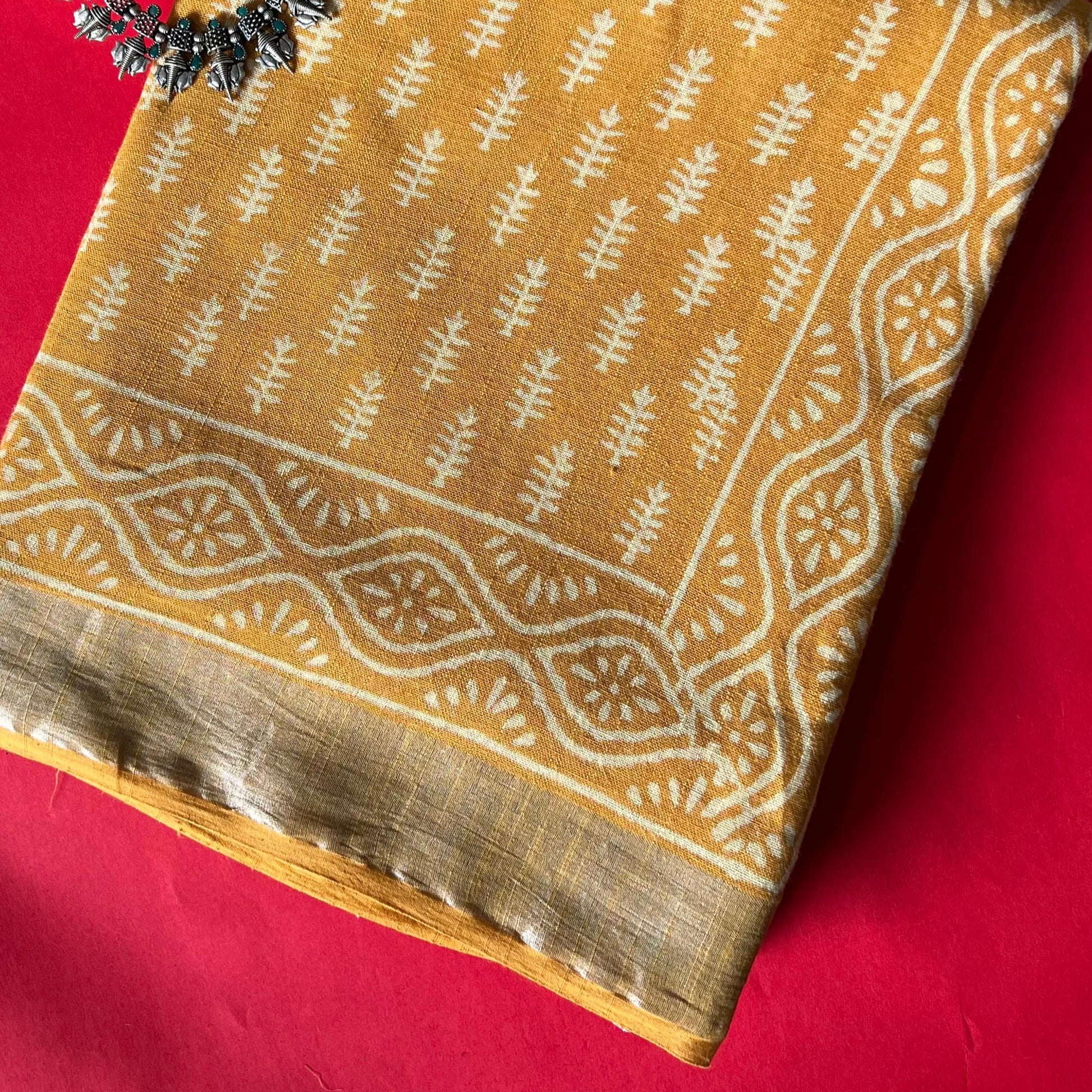 This Yellow cotton linen saree is designed for those who value comfort alongside sophistication. Its expertly blended fabric offers a natural texture and a crisp drape, ensuring a polished look with effortless ease. Ideal for various occasions, it combines breathable comfort with timeless elegance.The perfect fabric blend gives it a natural texture with a crisp drape.