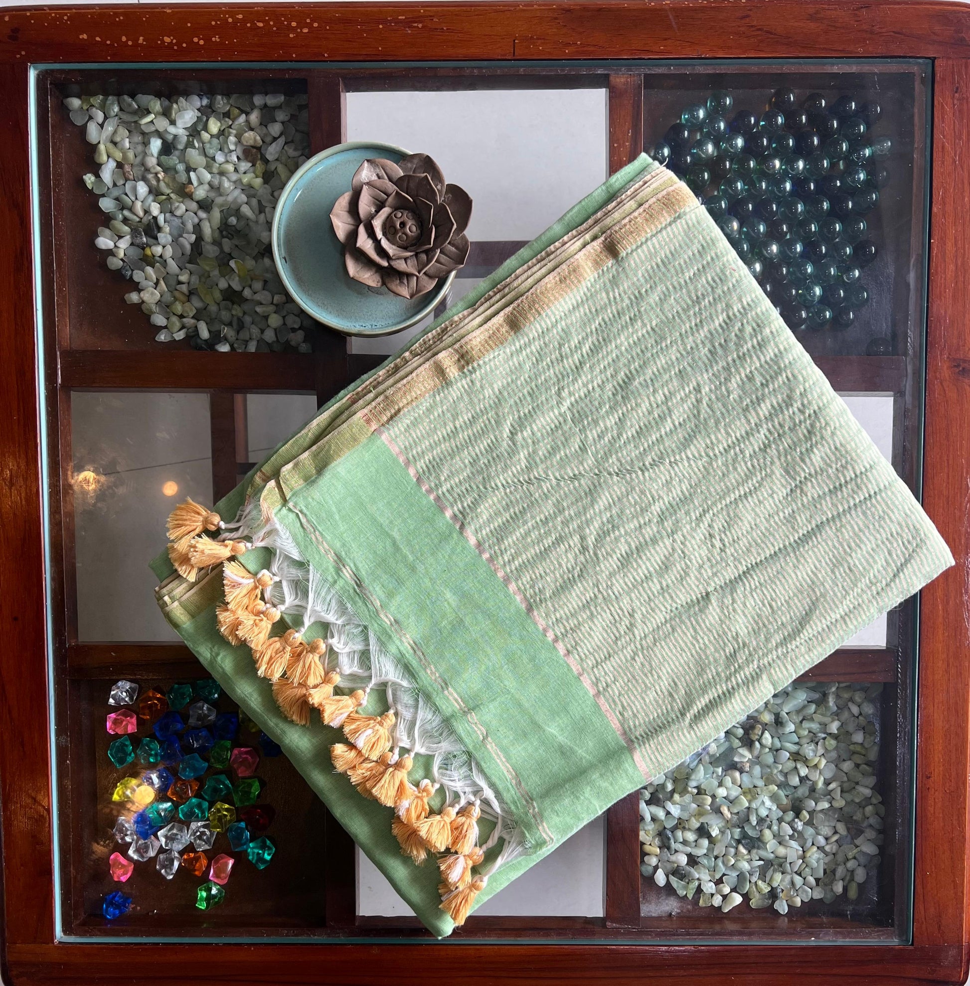This cotton saree features a delicate gold border and is crafted from soft fabric in a pista green shade. It showcases a subtle triangle pattern complemented by small yellow tassel, combining elegance with traditional charm.