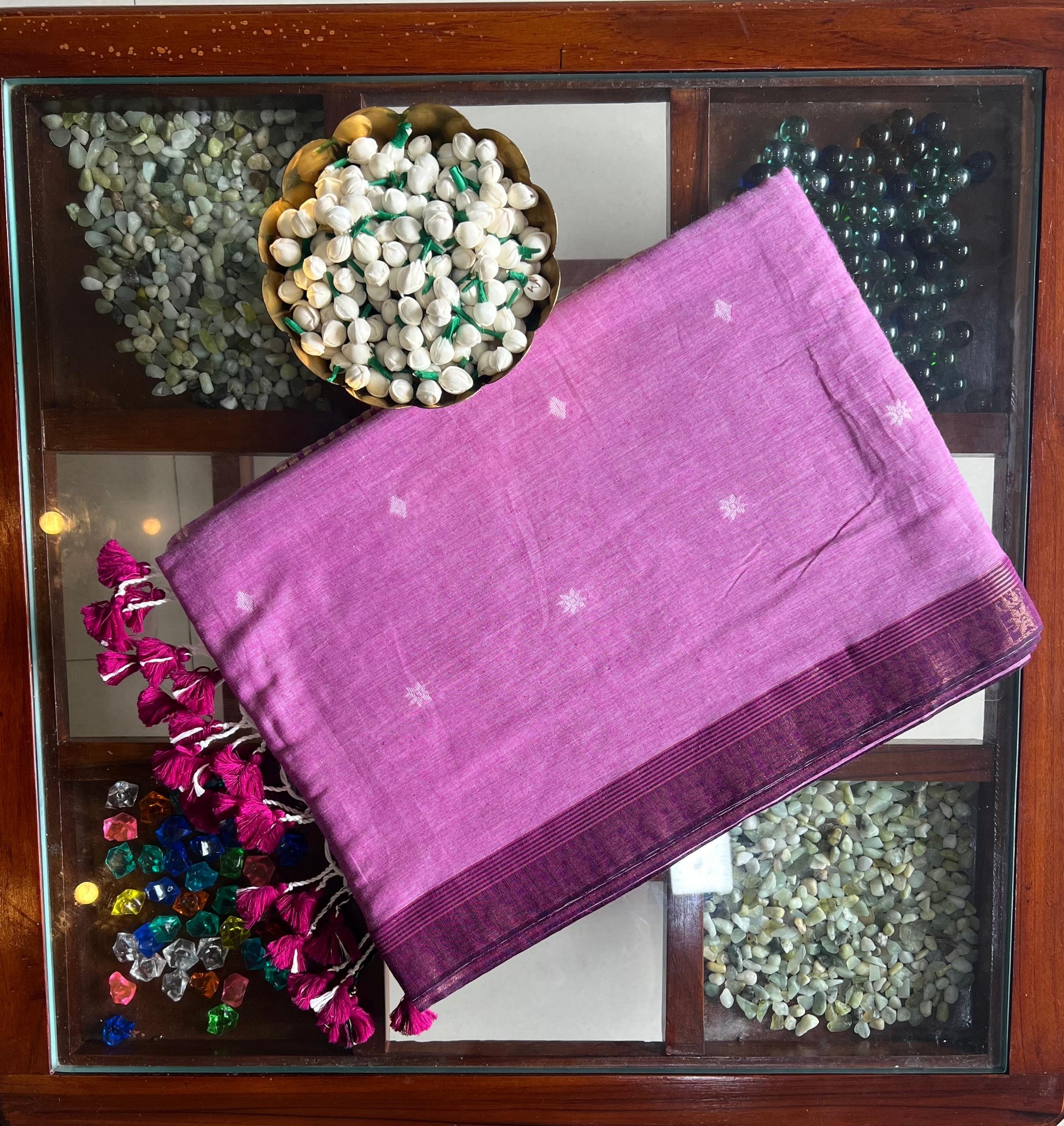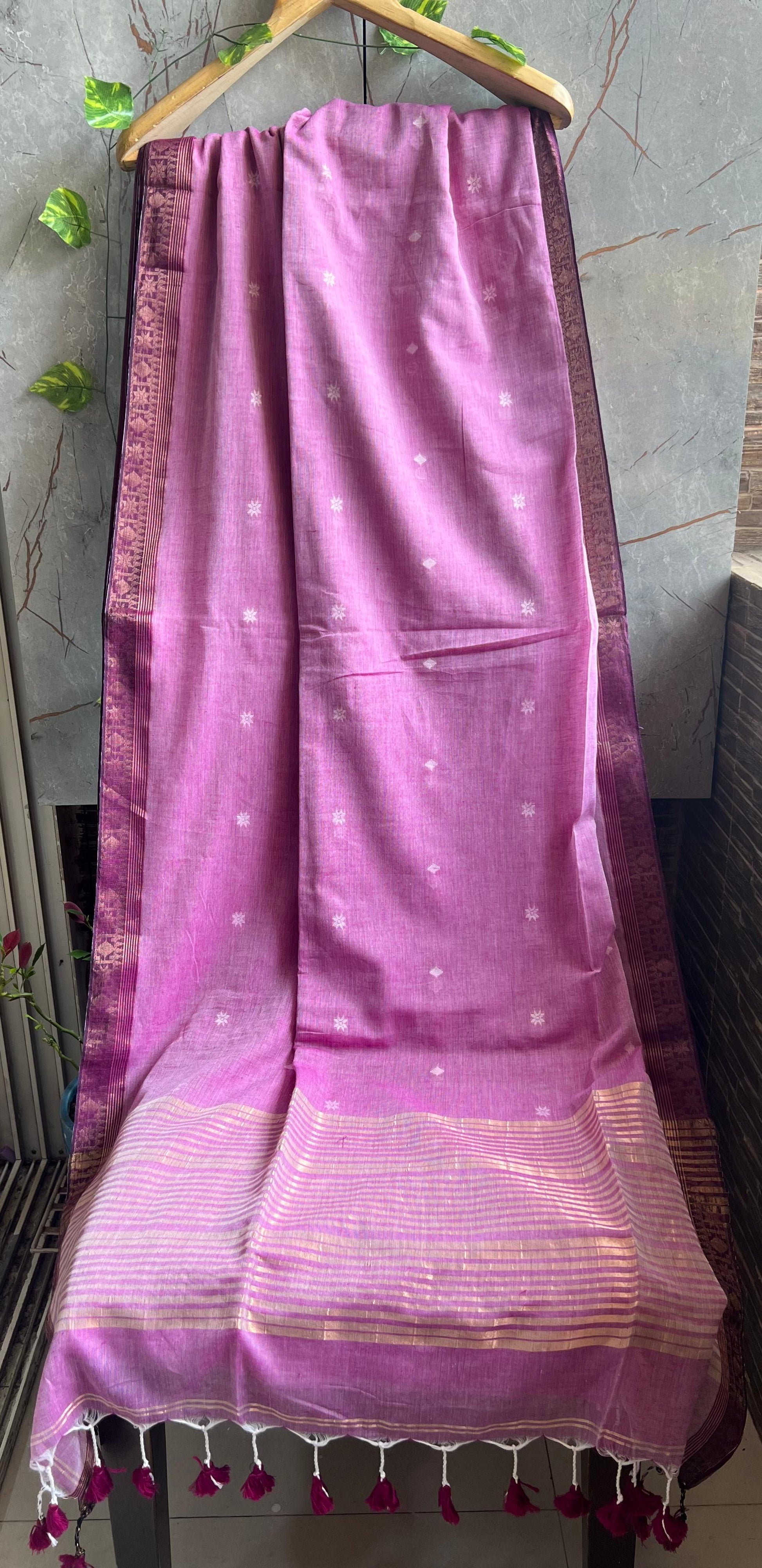 This cotton saree features a delicate gold border and is crafted from soft fabric in a Magenta Pink shade. It showcases a subtle white pattern complemented by pink tassel, combining elegance with traditional charm.
