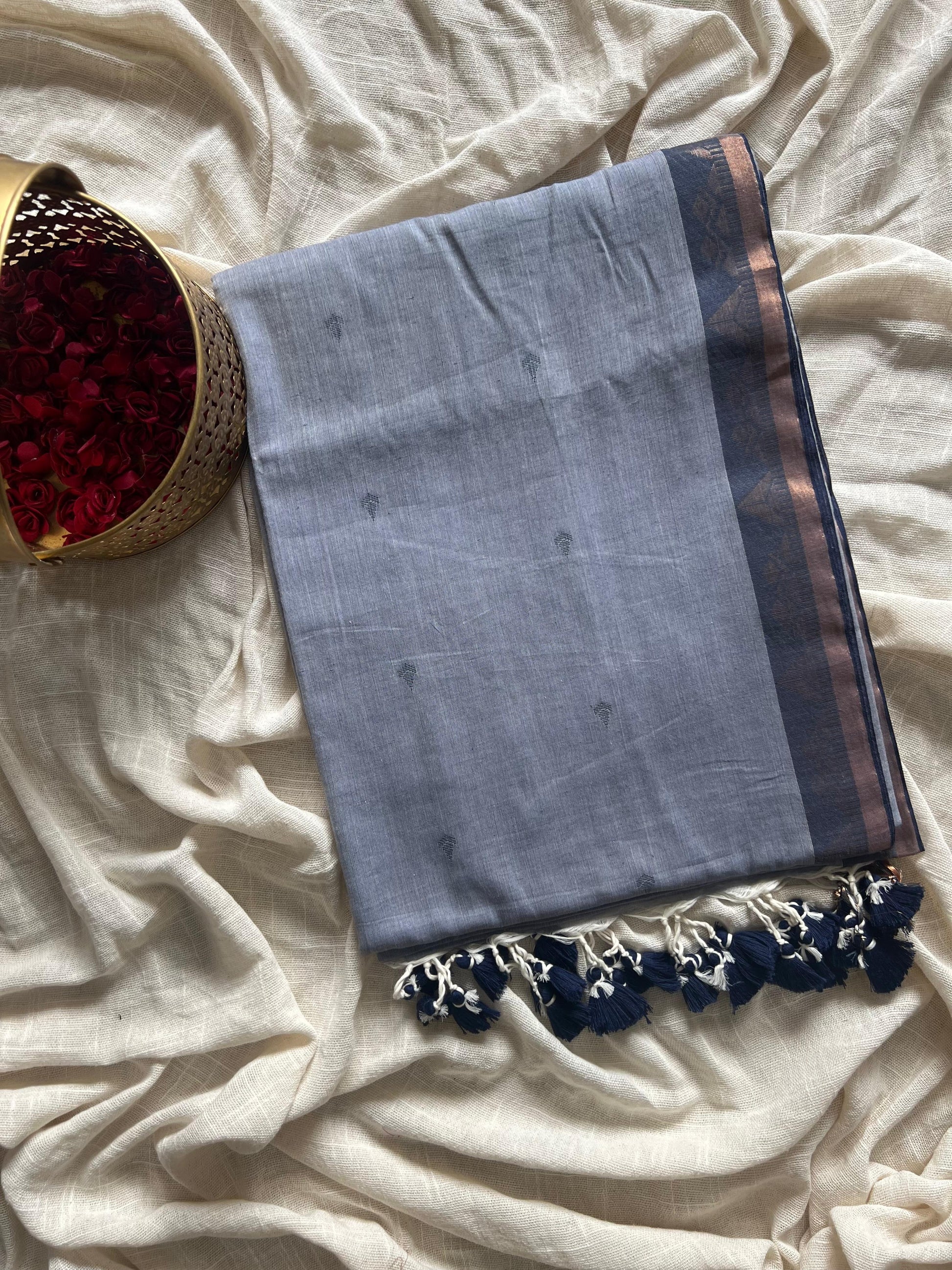 This cotton saree features a delicate gold border and is crafted from soft fabric in a light grey shade. It showcases a subtle blue pattern complemented by dark blue tassel, combining elegance with traditional charm.