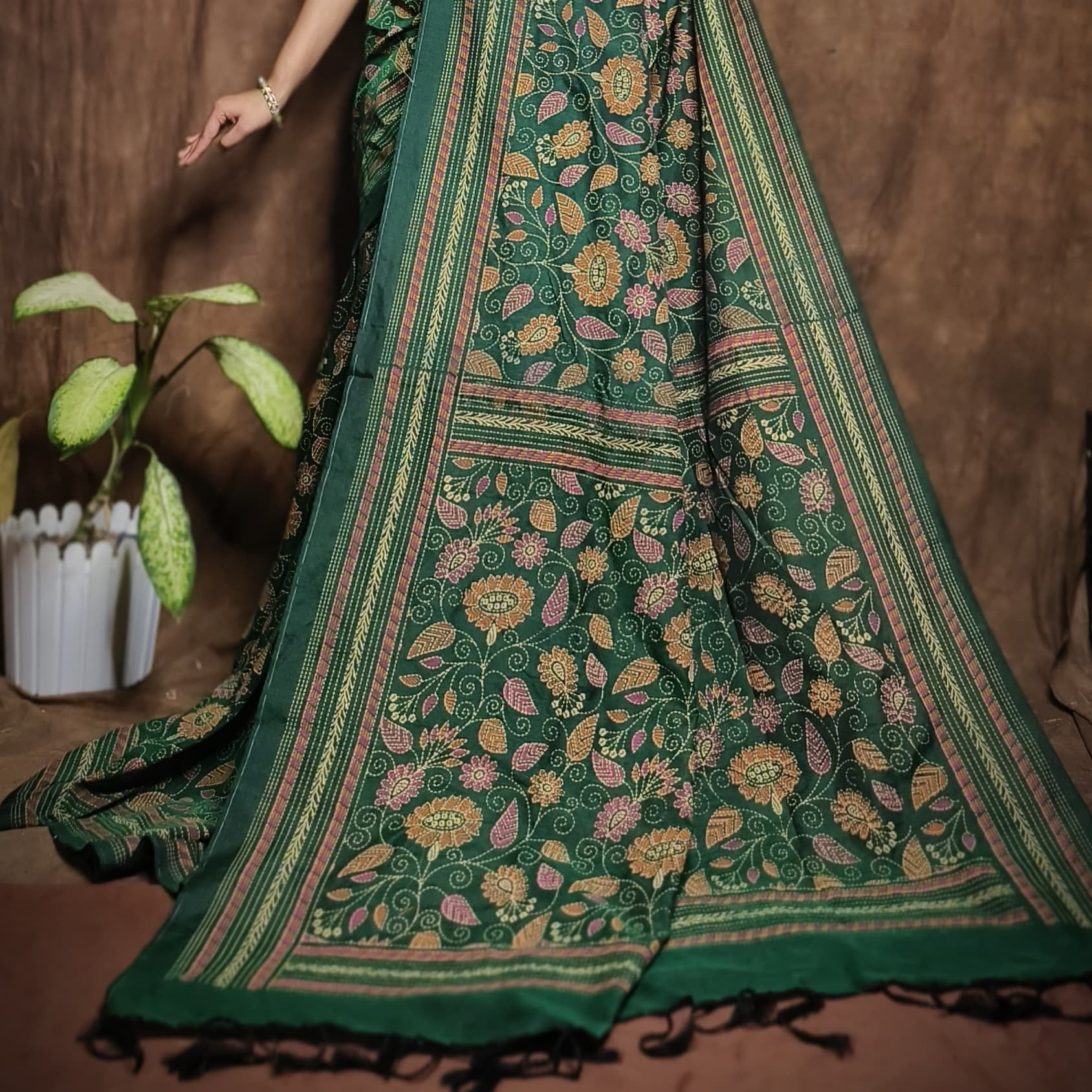 Green Kantha Print Saree Handcrafted elegance meets everyday comfort in this striking green khadi cotton saree.