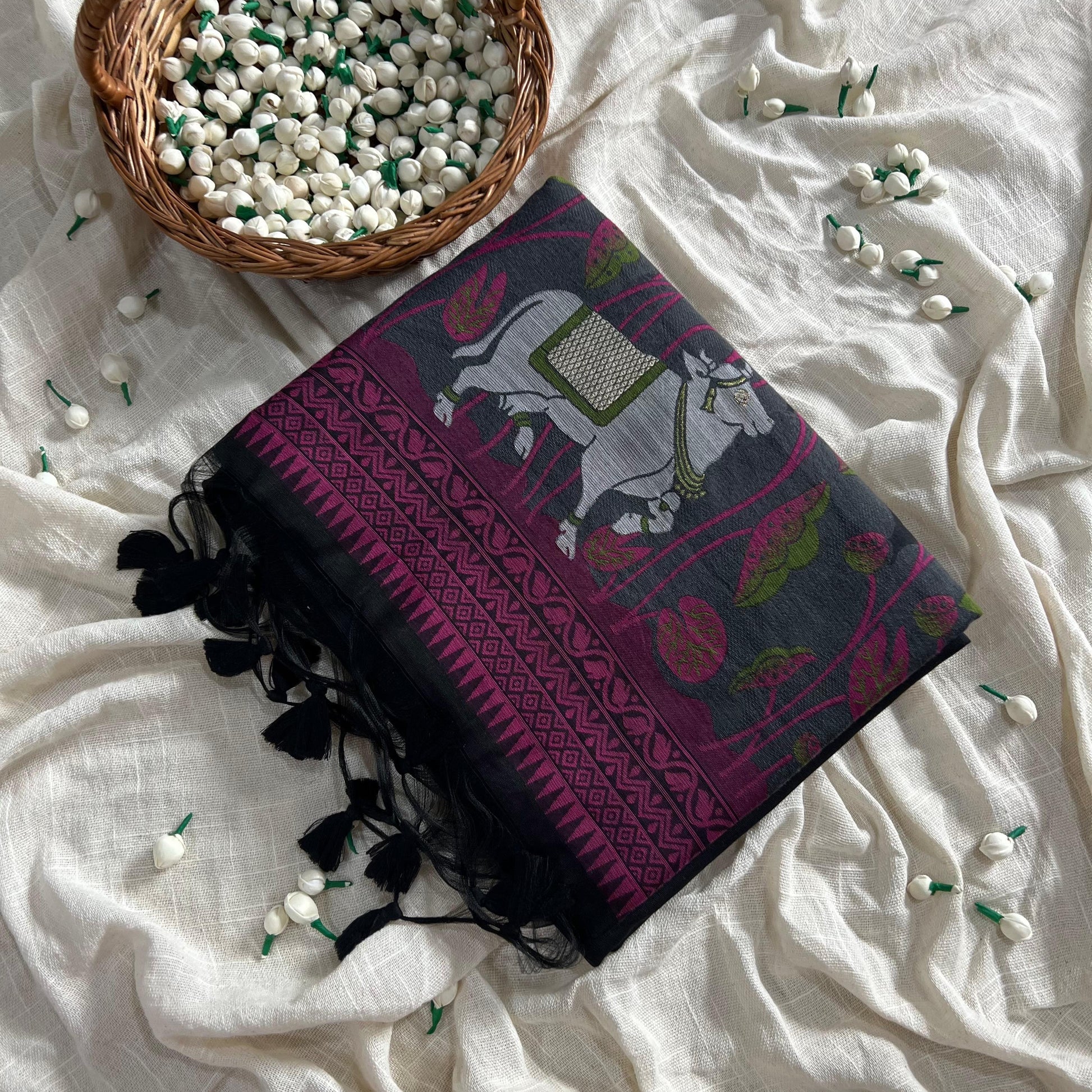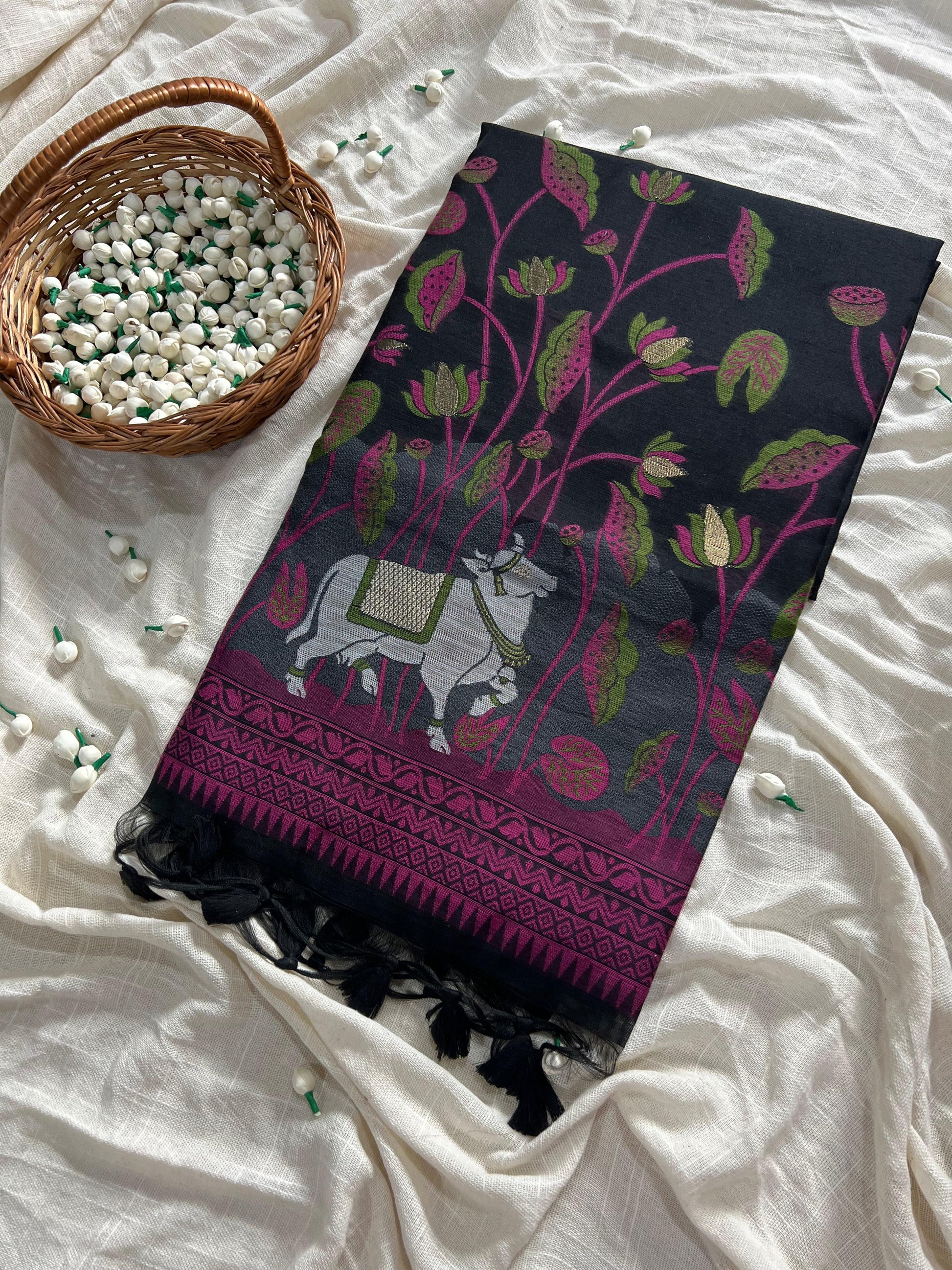 Inspired by traditional art, this Muga Cotton saree is a statement piece.