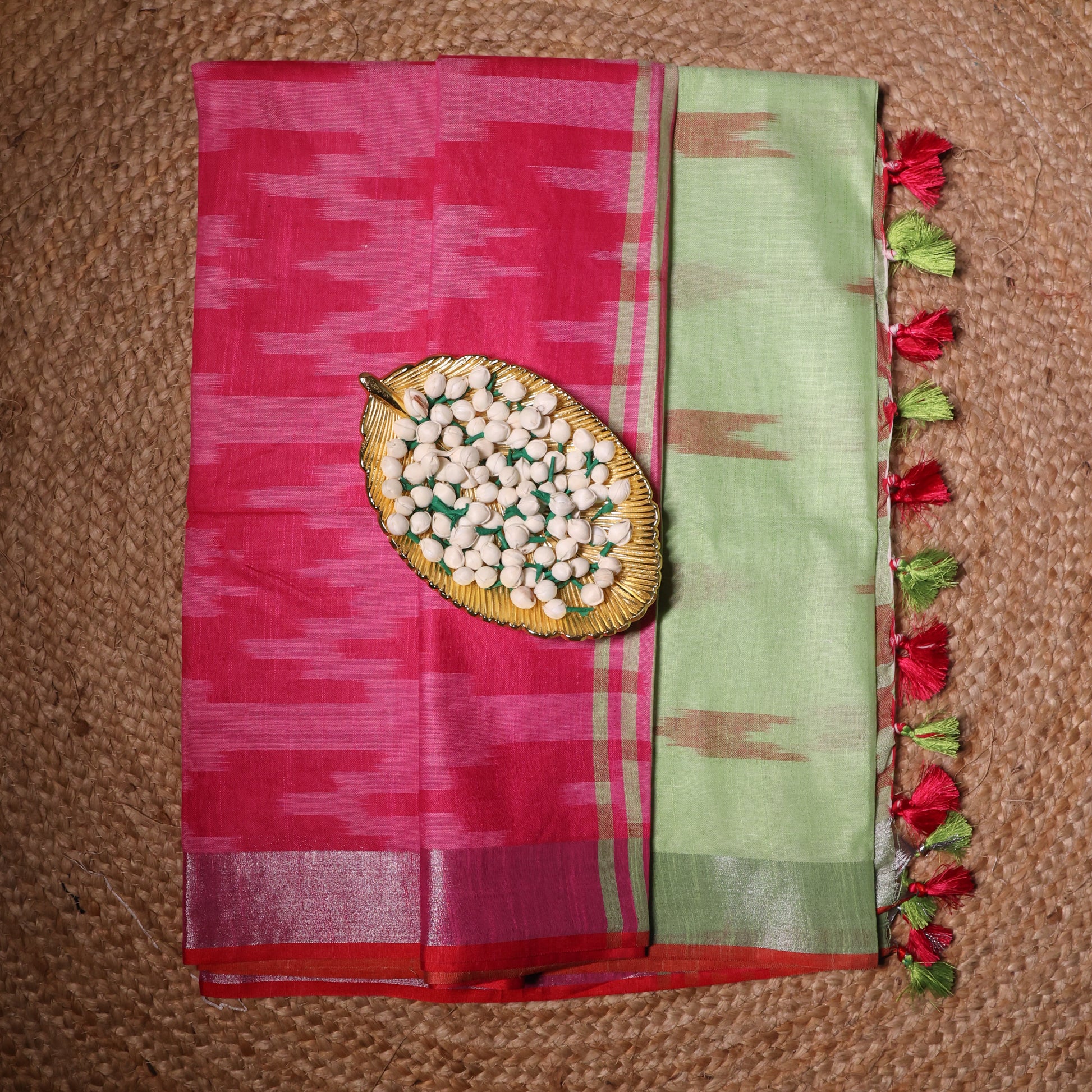 This Ikkat cotton saree in vibrant red features a traditional temple border, blending classic design with breathable, comfortable fabric.