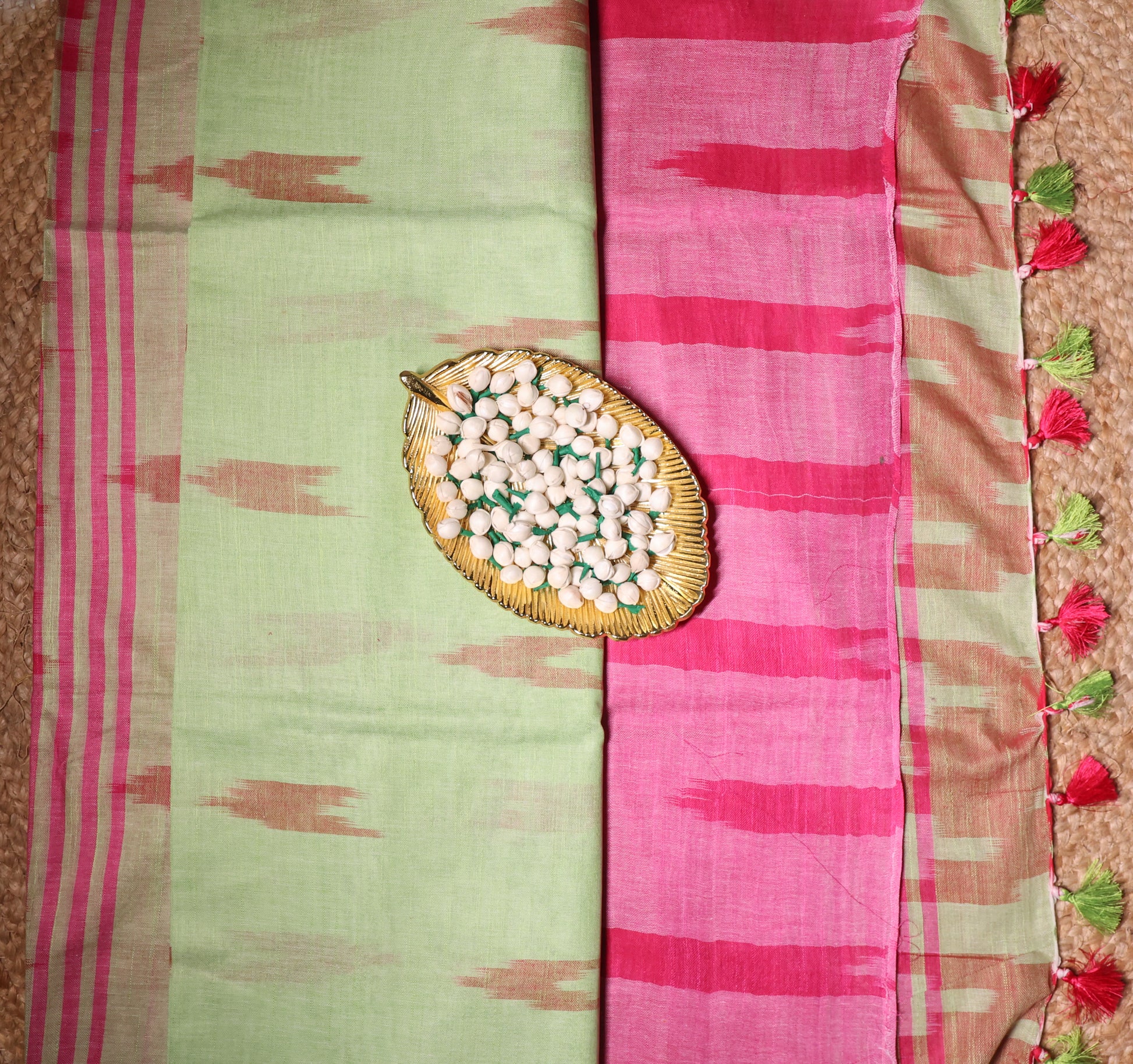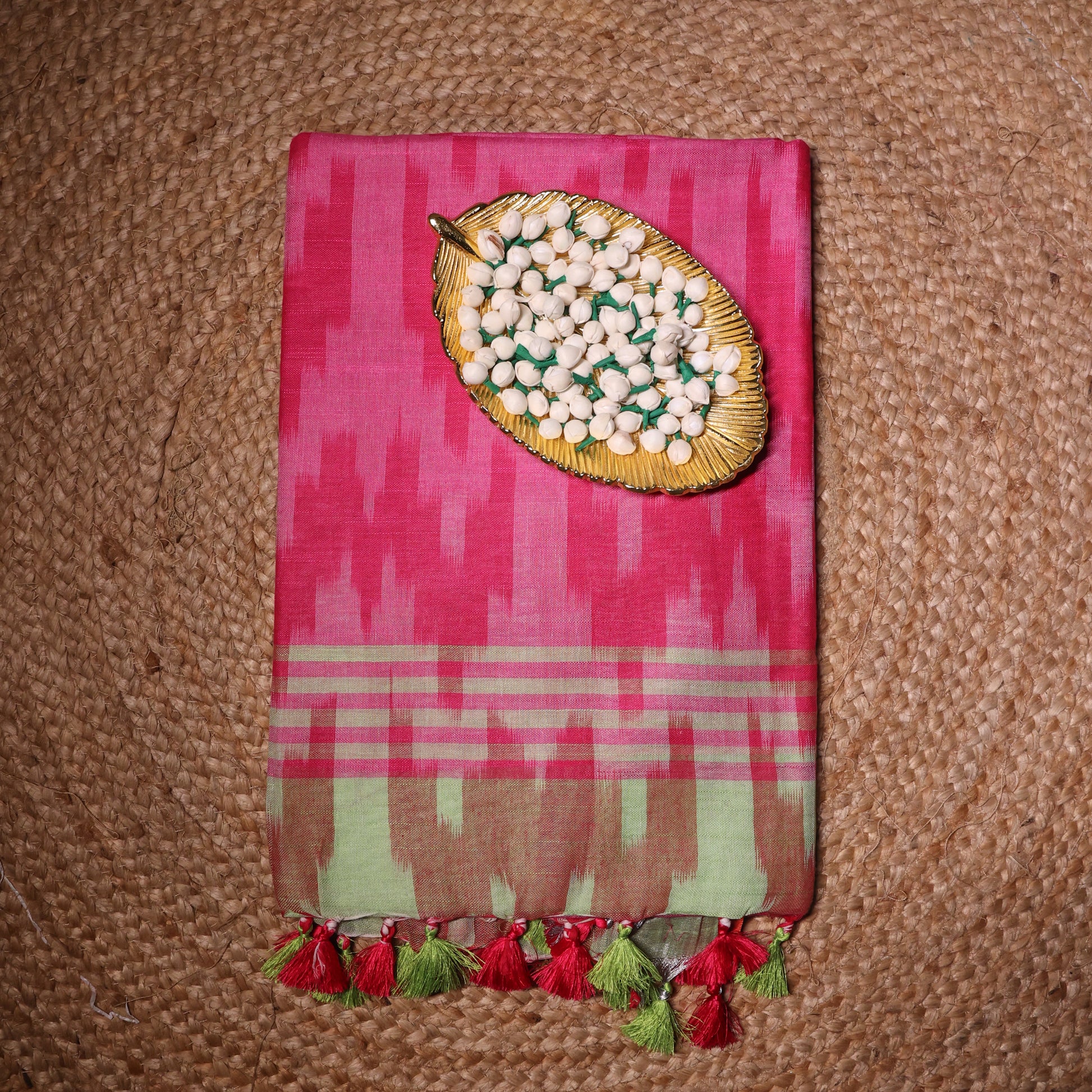 Pair this Ikkat cotton saree with minimal gold jewelry to highlight its intricate temple border. Opt for a sleek bun or soft waves to complement the traditional yet vibrant look.
