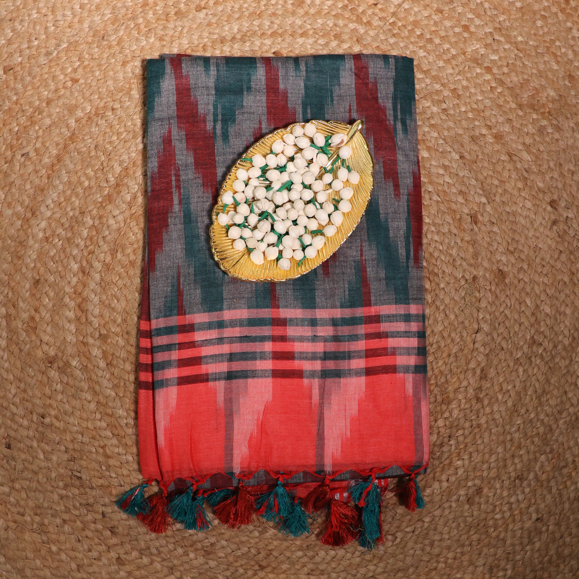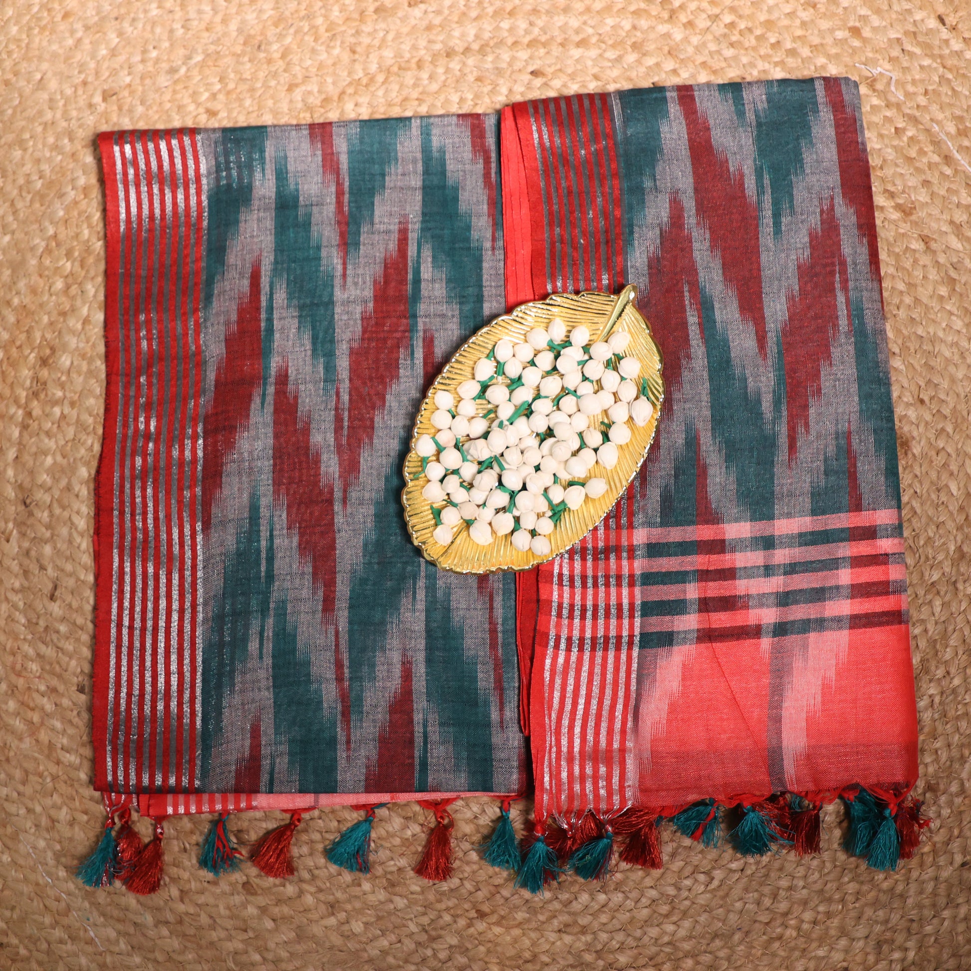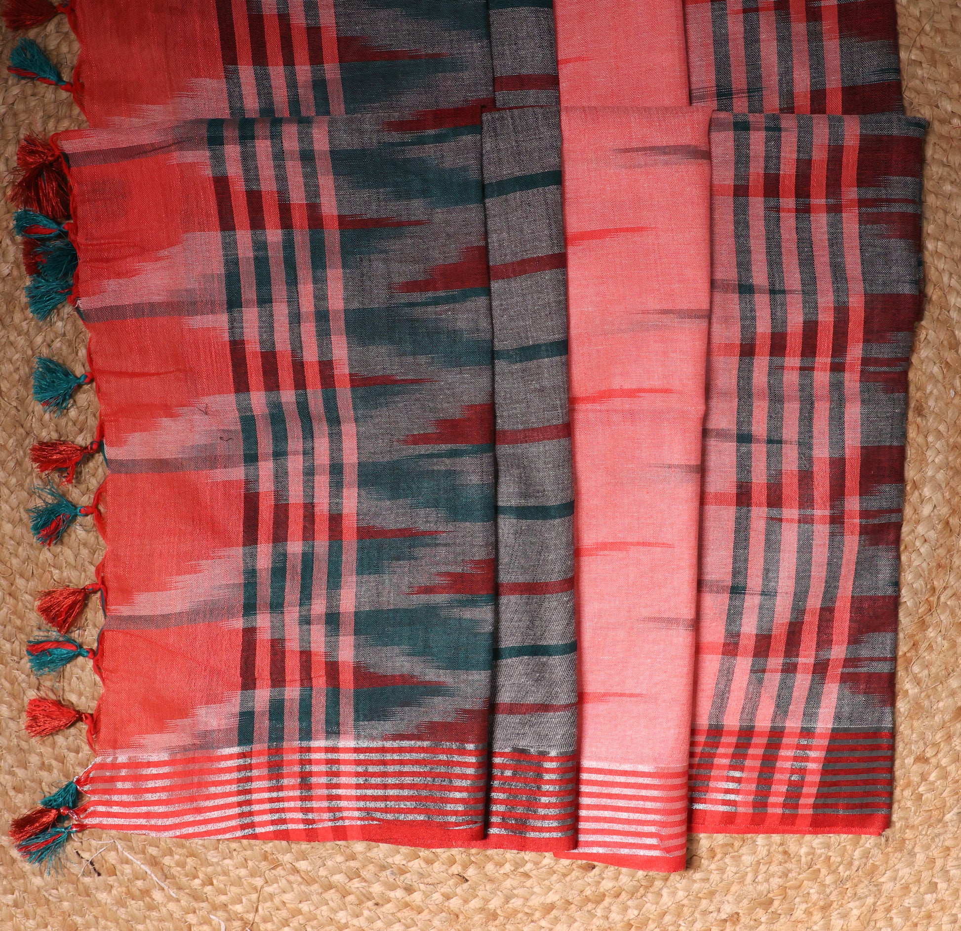 This Ikkat cotton saree in vibrant red features a traditional temple border, blending classic design with breathable, comfortable fabric.