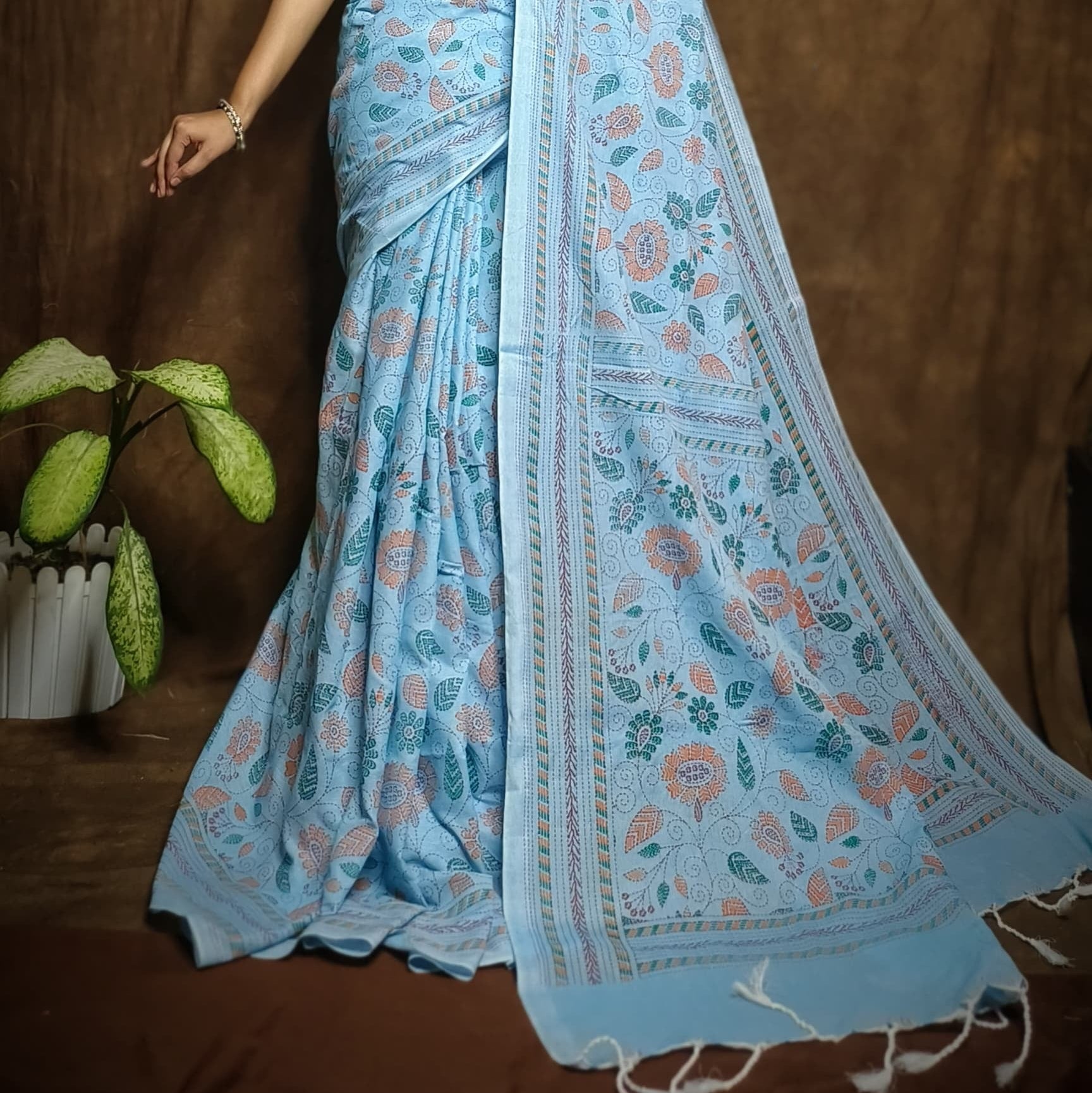 Sky Blue Kantha Print Saree Handcrafted elegance meets everyday comfort in this striking blue khadi cotton saree.
