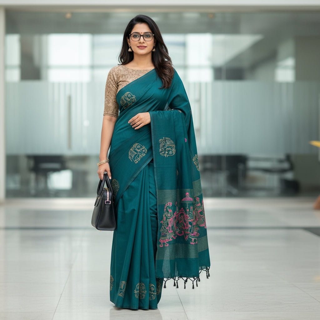 Paired with a contrasting beige blouse, this ensemble creates a sophisticated color palette that flatters various skin tones. Ideal for casual gatherings, festive occasions, or professional settings, this saree offers versatility without compromising on style.