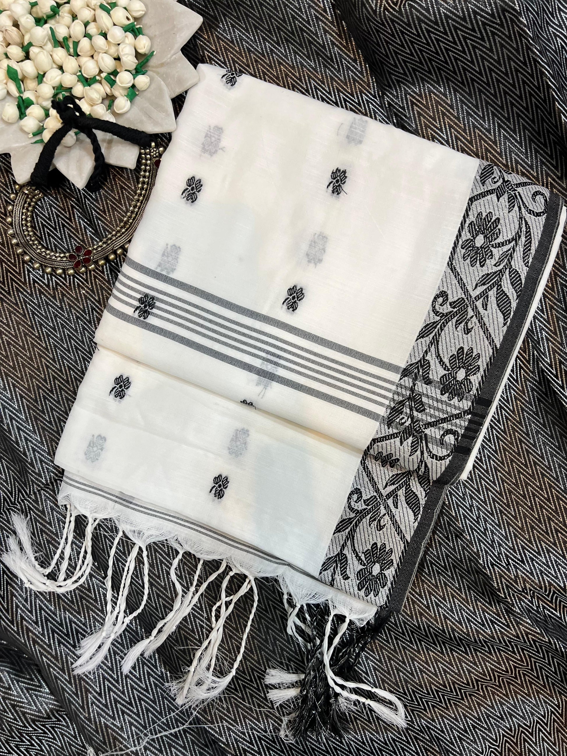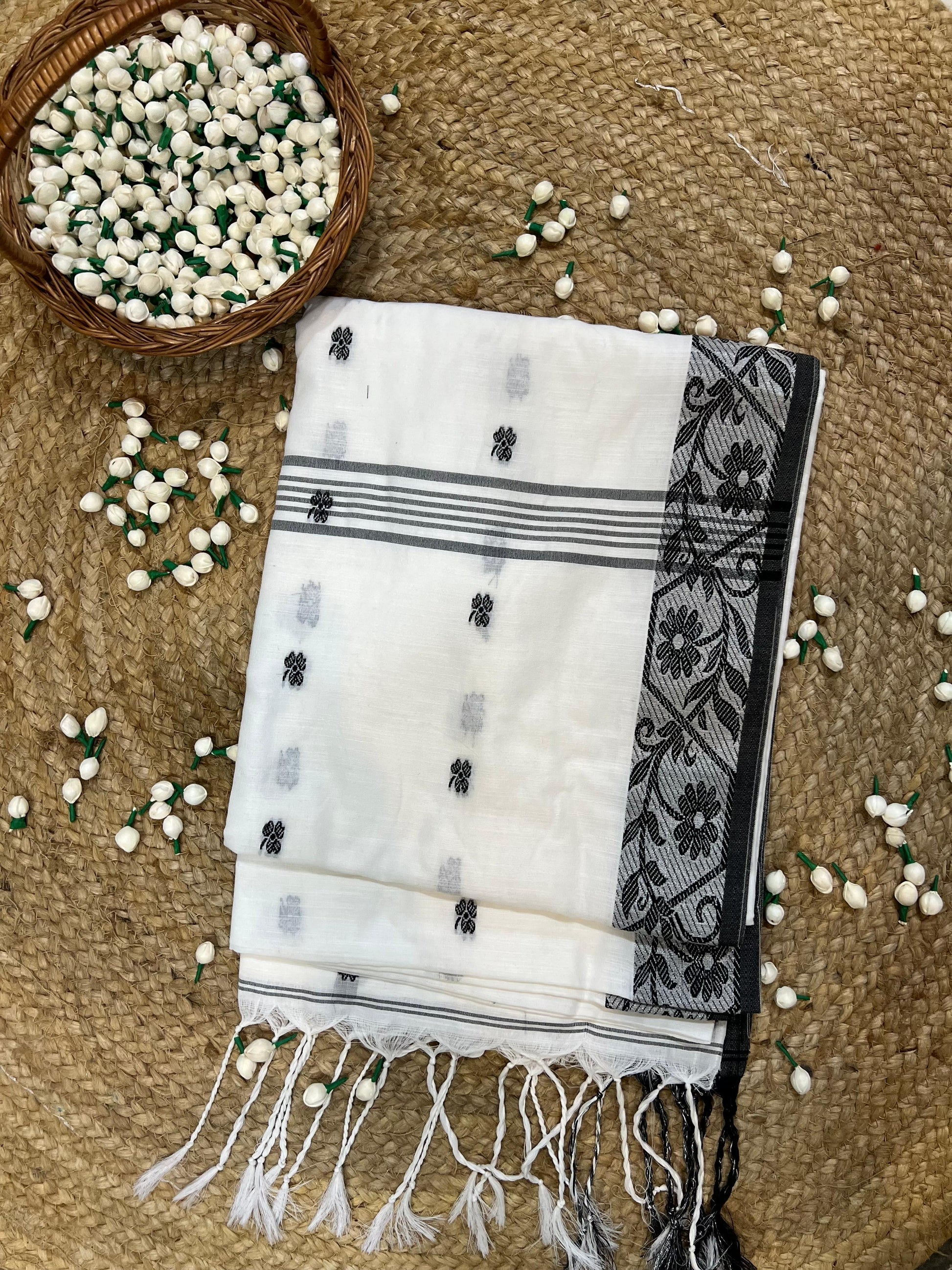 This elegant white cotton mul saree features delicate butti motifs and a beautifully crafted floral border, combining traditional charm with refined craftsmanship.