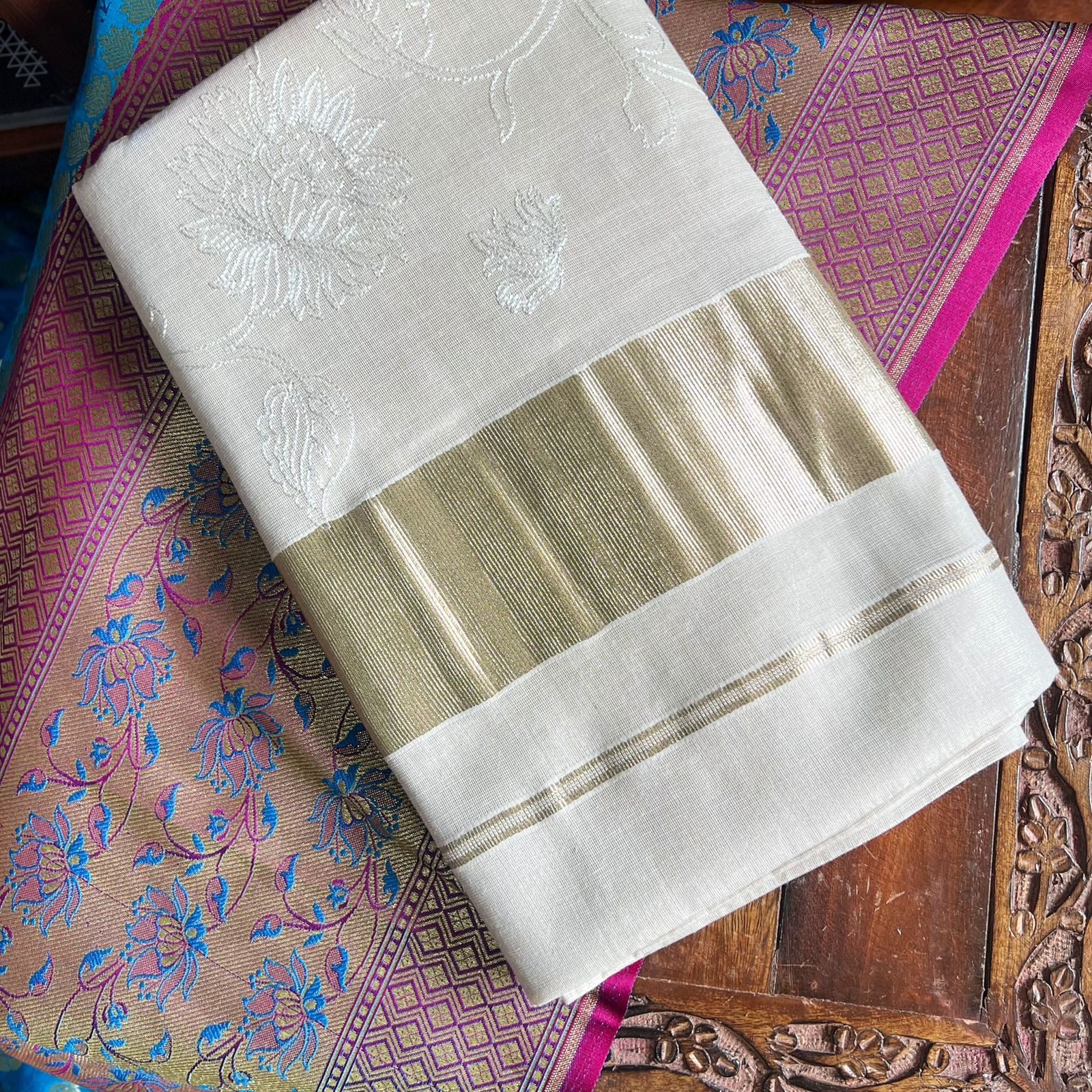 This white Kasavu saree features a pristine base accented with delicate silver embroidery along the border, offering a sophisticated update to traditional Kerala attire.